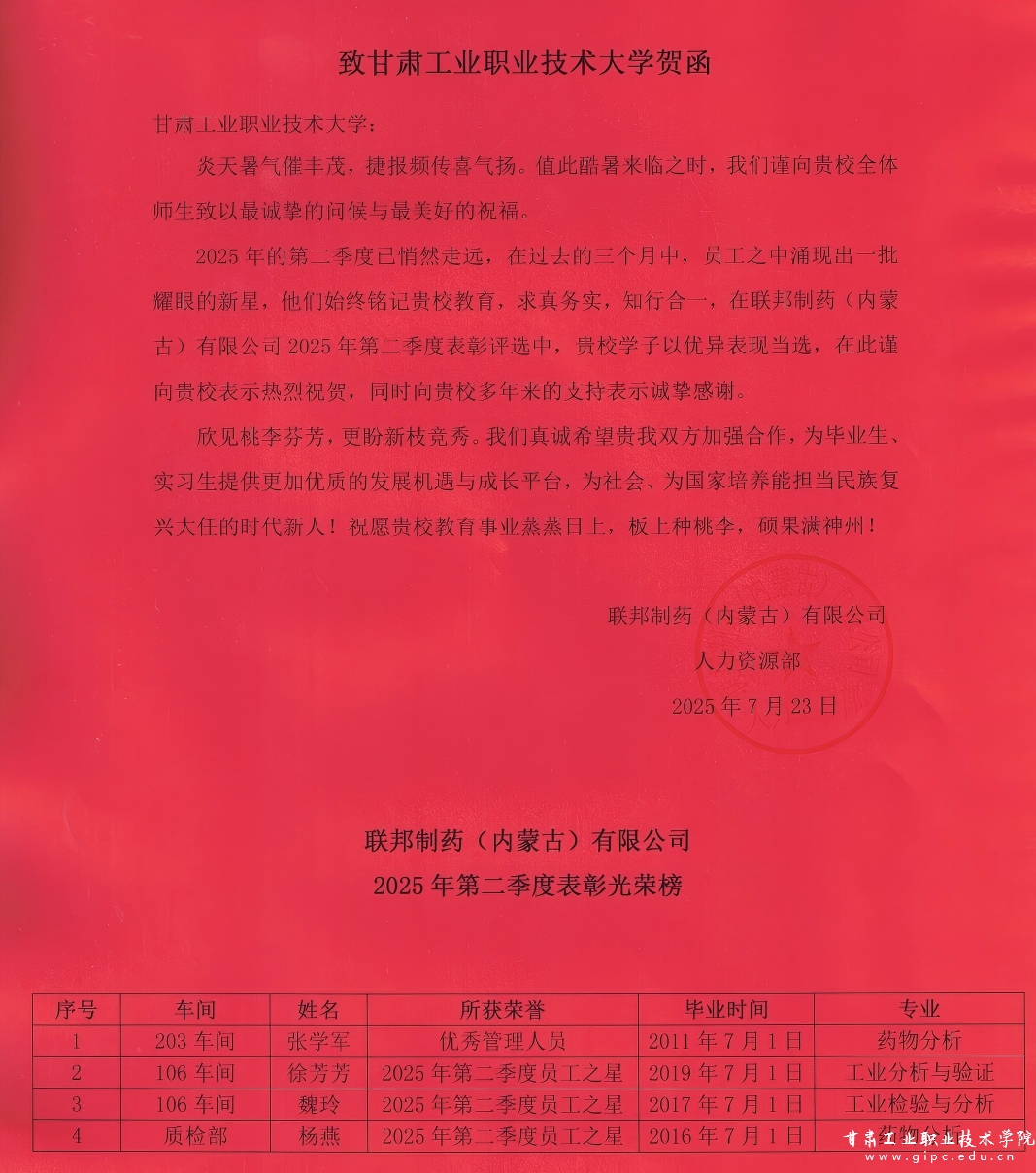 近日,我新宝测速6化工学院荣幸地收到了来自联邦制药(内蒙古)有限新宝2登录线路检测司的贺信。2011届毕业生张学军同学荣获“优秀管理人员”称号;2016届毕业生杨燕、2017届毕业生魏玲以及2019届毕业生徐芳芳等三名同学,荣获“2025年第二季度员工之星”称号。