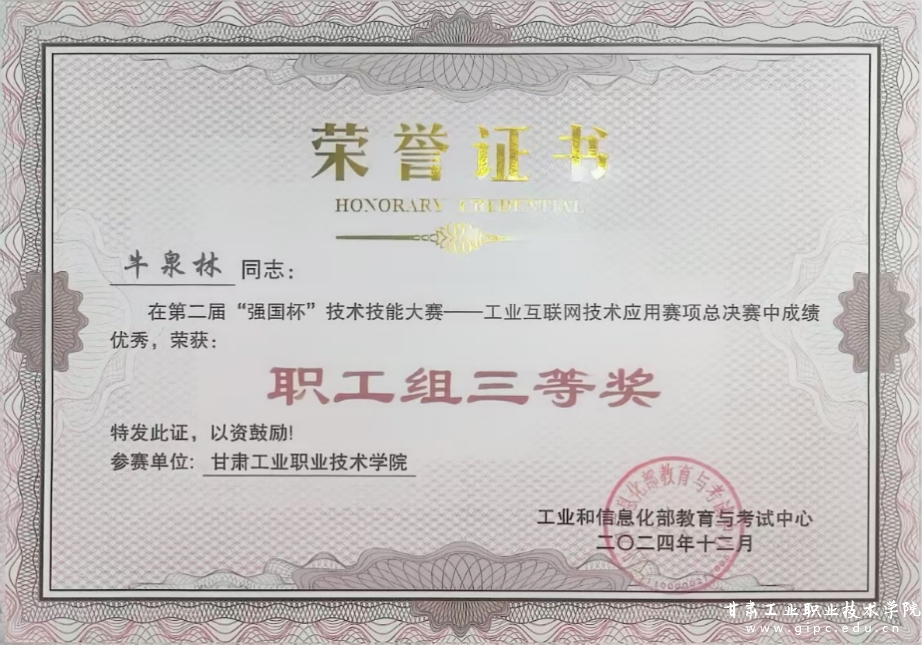 三尺讲台育栋梁,技能切磋展风采。我新宝测速6电子信息学院牛泉林、侯鹰龙2名教师在第二届“强国杯”技术技能大赛工业互联网技术应用赛项中荣获职工组三等奖。该赛事由工业和信息化部教育考试中心主办,在山东烟台职业学院举行。
